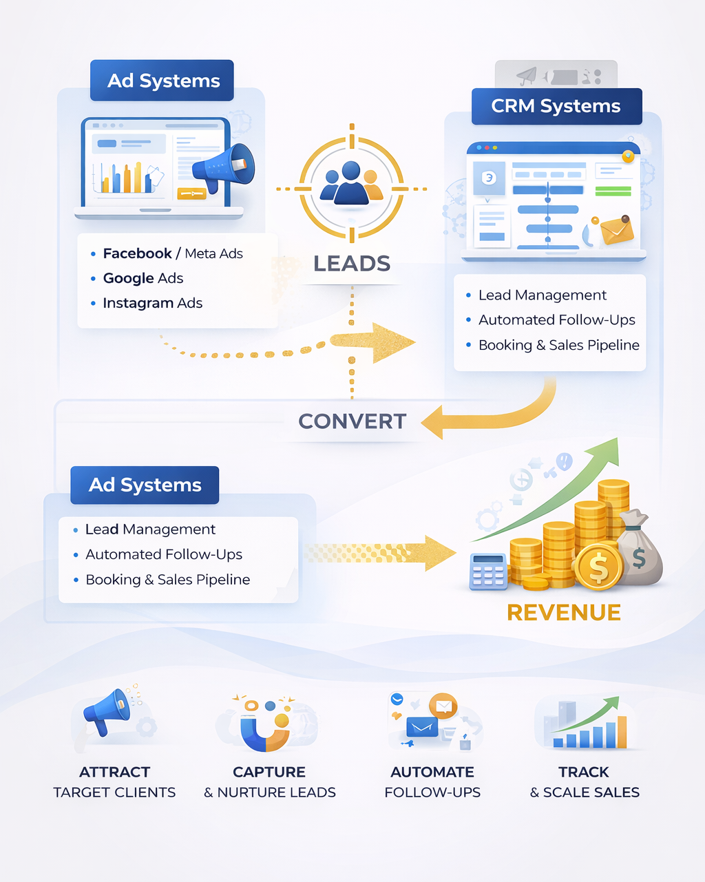 Lead capture → CRM pipeline → automated follow-ups → booked clients.
