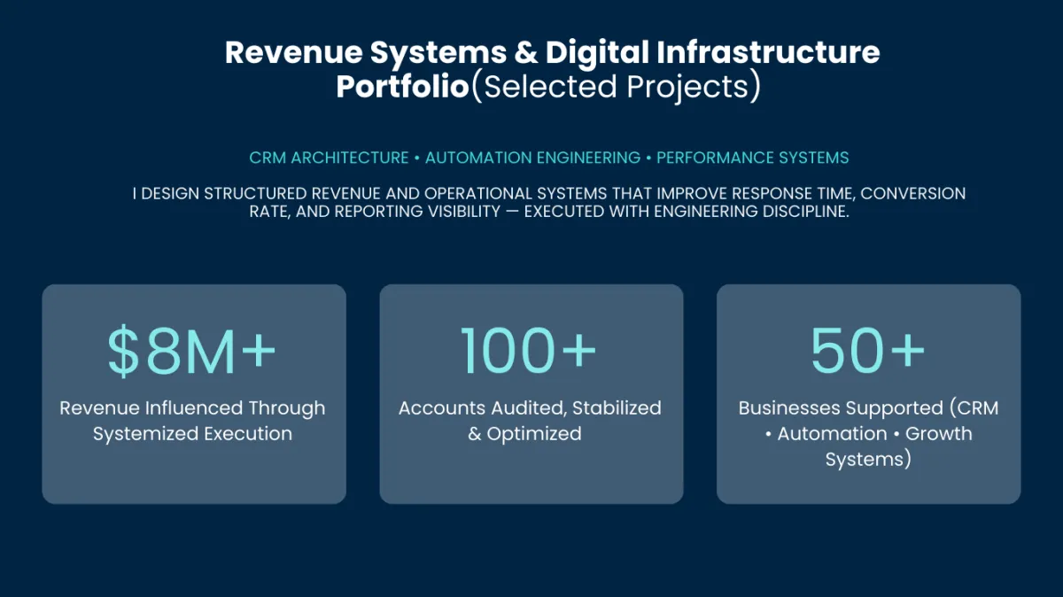 Before scaling marketing or automation, the system architecture must be designed properly — funnels, pipelines, and workflows working as one operational system.