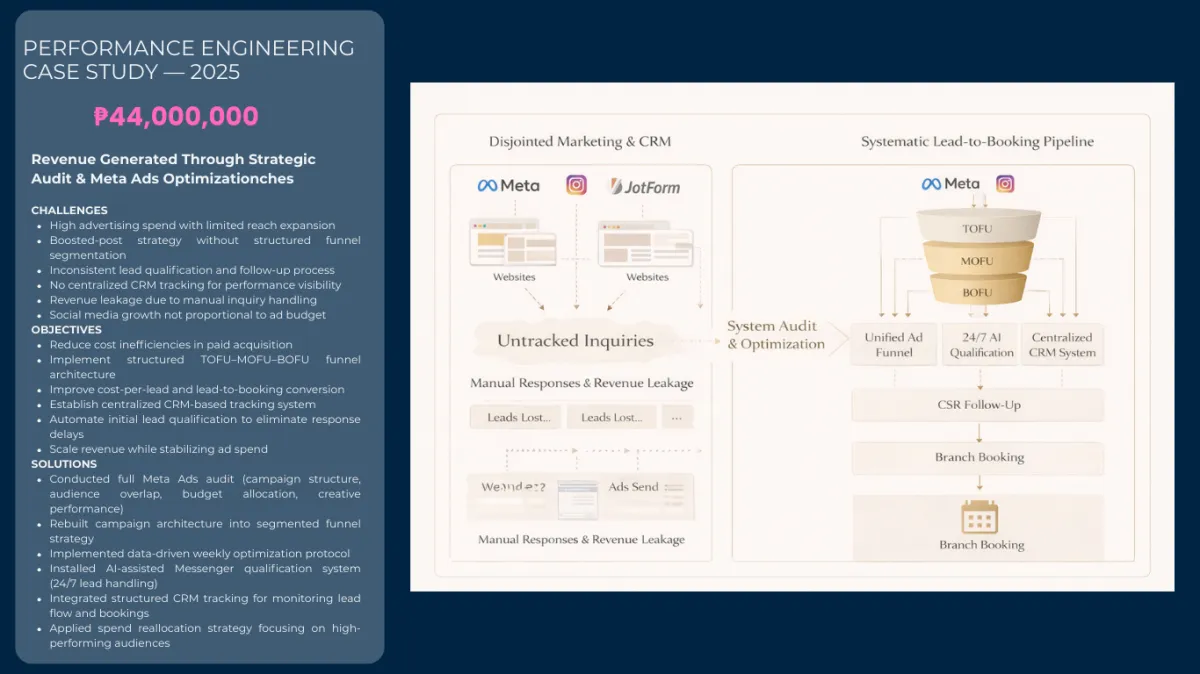 • Full funnel ecosystem architecture (Meta Ads, Creatives, Website, Conversion)